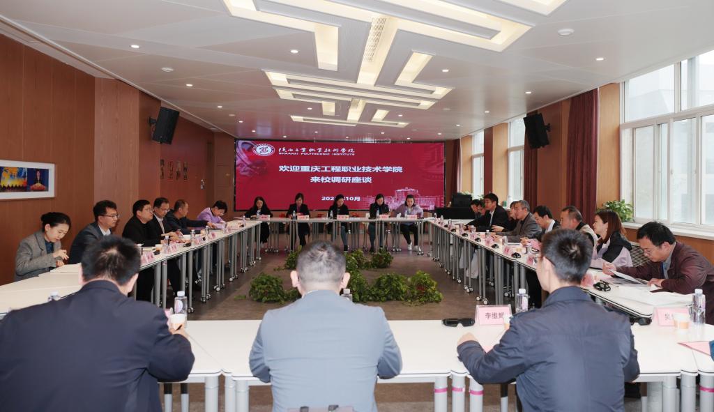 10月12日上午,重庆工程职业技术学院校长张进带队一行40余人来校调研交流。学校党委书记惠朝阳、党委副书记田昊、副校长梅创社及相关部门负责人陪同座谈,座谈会分两组分别在崇文南楼九楼第一会议室及崇文南楼三楼马院VR智慧思政实训中心进行,座谈会分别由党委副书记田昊、副校长梅创社主持。