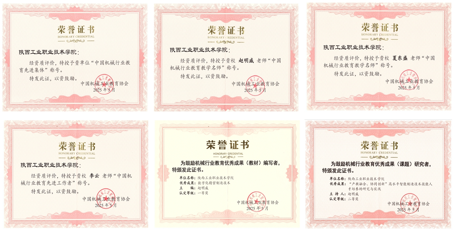 会上,我校获批“中国机械行业教育先进集体”;机械工程学院赵明威教授、电气工程学院夏东盛教授被评为“中国机械行业教育教学名师”;材料工程学院李云教授被评为“中国机械行业教育先进工作者”;赵明威教授主编的《数字化精密制造技术》获机械行业教育优秀成果(教材)一等奖,主持的《“产教融合、协同创新”高水平智能制造技术技能人才培养的研究与实践》获机械行业教育优秀成果(课题)二等奖。