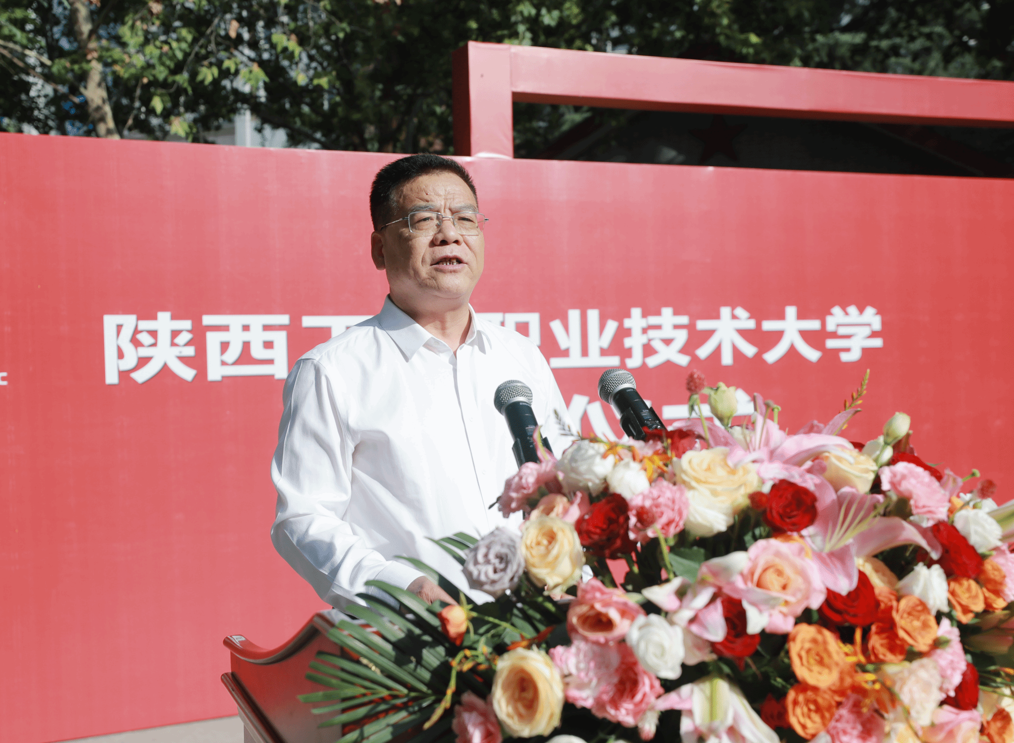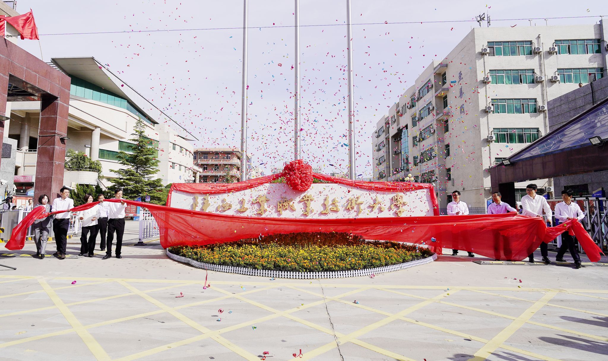 陕西省委教育工委委员、省教育厅副厅长申雪峰,咸阳市委常委、常务副市长王宏兵,陕西省教育厅发展规划处处长唐澍,中共渭城区委书记田地;学校党委书记惠朝阳、校长刘永亮,校领导班子成员康强、贺天柱、梅创社、刘清出席揭牌仪式。退休老领导、校友代表、企业代表、中层干部、师生代表等在承载着学校厚重历史与精神的王达成匠心文化广场共同见证了这一历史时刻。