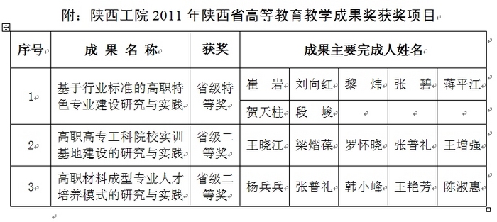 近日,2011年陕西省高等教育教学成果奖评审活动结束,我院申报的三项教学成果分别喜获特等奖一项,二等奖两项。其中,崔岩教授主持的“基于行业标准的高职特色专业建设研究与实践”获2011年陕西省高等教育教学成果奖特等奖,这是高职院校在2011年省级教学成果奖中唯一获得的一项特等奖,同时填补了我院省级教学成果特等奖的空白。此外,王晓江教授主持的“高职高专工科院校实训基地建设的研究与实践”和杨兵兵副教授主持的“高职材料成型专业人才培养模式的研究与实践”分别获得2011年陕西省高等教育教学成果奖二等奖。