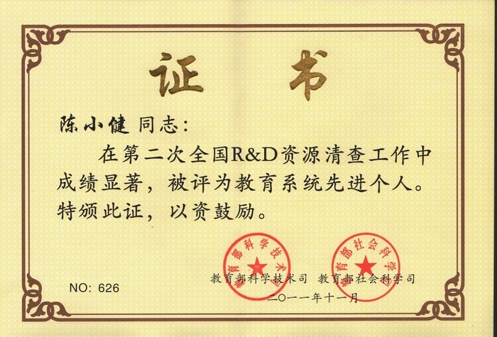 近日,教育部科学技术司和社会科学司联合下发了《关于表彰教育系统第二次全国R&D资源清查先进集体和先进个人的通知》(教技司【2011】352号),对在资源清查工作中做出突出成绩的集体和个人进行了表彰。我院科研处陈小健同志成绩显著,被评为第二次全国R&D资源清查教育系统先进个人。