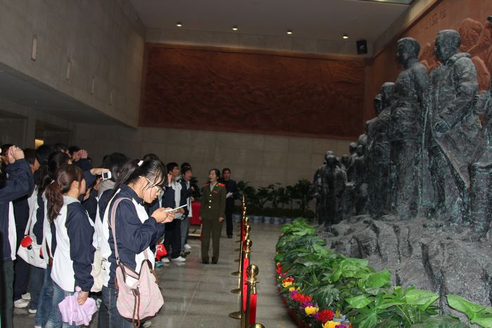 同学们瞻仰大幅主题群雕“峥嵘岁月”