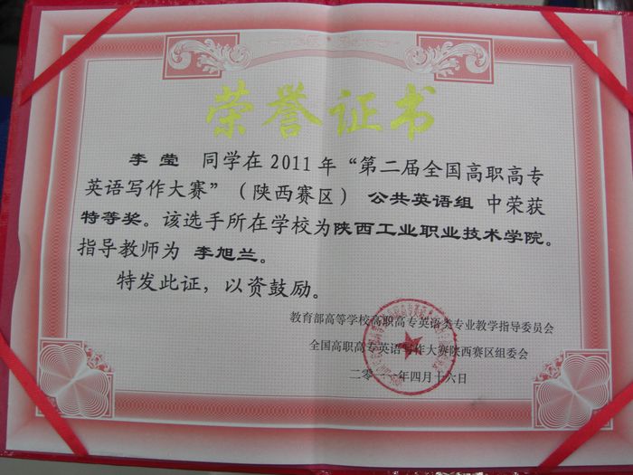 全国高职高专英语写作大赛是由国家教育部英语教指委主办的一项针对高职高专学生的英语赛事,分学校初赛、省级半决赛和全国总决赛三个阶段的比赛。2011年4月初,我院在校内进行了层层选拔,最后纺检0904班的李莹同学、服装设计1003班的赵丹丹同学和商务英语0902的符阿龙同学在众多选手中脱颖而出,代表我院参加省级比赛,与来自陕西23所学校的57名选手进行了角逐。大赛最后评出了专业英语组特等奖3名,一等奖1名,二等奖2名,三等奖3名,公共英语组特等奖5名,一等奖2名,二等奖6名,三等奖13名。我院纺检0904班李莹同学获公共英语组特等奖,商务英语0902班符阿龙同学获专业英语组三等奖。