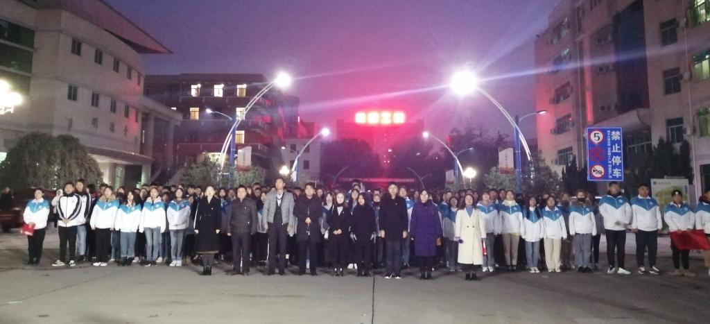 7点整,升旗仪式正式开始。在初冬的寒风中,国旗护卫队的队员们迈着坚定而有力的步伐,喊着嘹亮的口号,护送鲜艳的五星红旗走向升旗台。伴随着雄壮的国歌声,五星红旗迎着朝阳冉冉升起,全体师生面向国旗行注目礼。