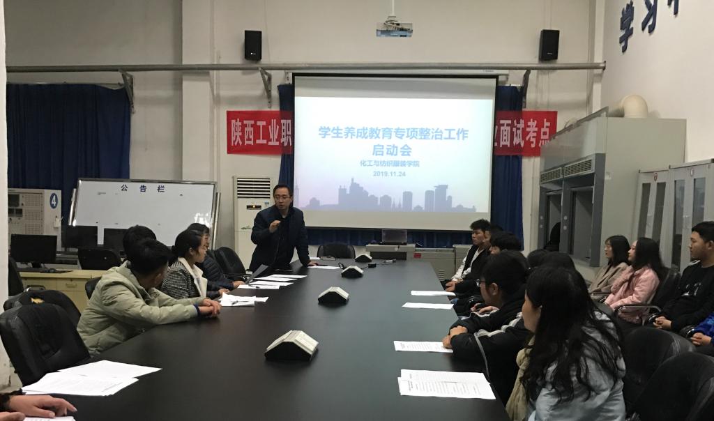 为了进一步加强学生日常教育和安全管理,培养学生良好的思想道德素质和行为习惯,11月24日晚,化工与纺织服装学院在化工实训中心召开学生养成教育集中专项整治活动启动会,2018、2019级全体辅导员、班主任及学生干部参加会议,会议由化纺服学院学工办主任王飞龙主持。