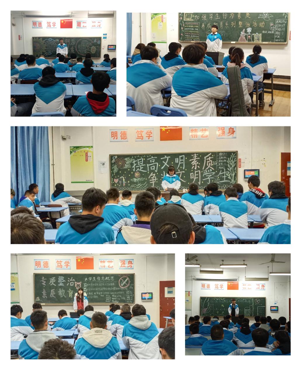 在主题班会开展过程中,班主任老师带领同学们一起学习了《关于进一步加强学生养成教育的实施意见》和学生处《学生养成教育集中专项整治活动方案》的通知精神,接着从学生“进校要求、文明礼貌、遵守纪律、环境卫生、学习习惯、宿舍安全”等十个方面就如何养成良好的行为习惯做了强调,讲解和示范相结合,用生动的语言和真实的事例传授给学生,提醒同学们要时刻保持警惕,提高自我防护意识,确保人身安全;要求学生干部和学生党员要以身作则,带头响应学院要求,自觉遵守规定。