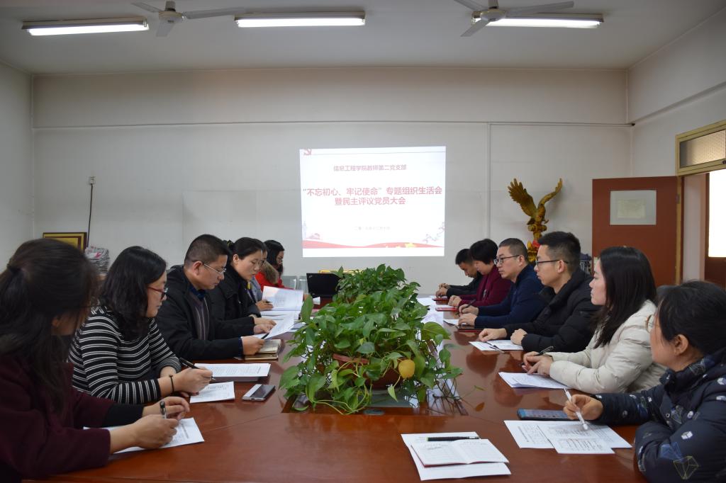 按照学院《关于召开“不忘初心、牢记使命”专题民主生活会、组织生活会和开展民主评议党员工作的通知》精神,12月10日下午,信息工程学院教师第二党支部在崇文楼806召开了“不忘初心、牢记使命”专题组织生活会暨民主评议党员大会。会议由第二党支部书记李俊主持,支部全体党员参加了会议。信息学院党总支书记闫军同志进行了全程督导。