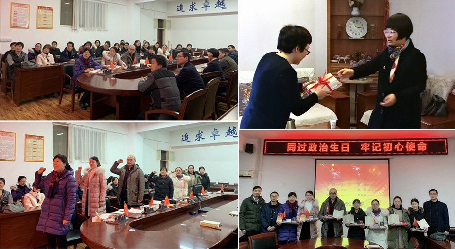 本次主题党日活动,围绕“贺一贺我们的政治生日”、“悟一悟共产党人初心使命”、“学一学党的光辉历程”三个环节开展。“贺一贺我们的政治生日”环节,党总支委员为12月入党的8名党员赠送了政治生日贺卡和礼物。党员张玉静因病常年休假,12月23日,党总支副书记王艳、教师第一党支部书记晋淑惠、分会主席王建武驱车来到张玉静同志西安的家中,给她送去了政治生日贺卡、党员标识、学习书籍等组成的政治生日“大礼包”,鼓励她积极与病魔抗争。