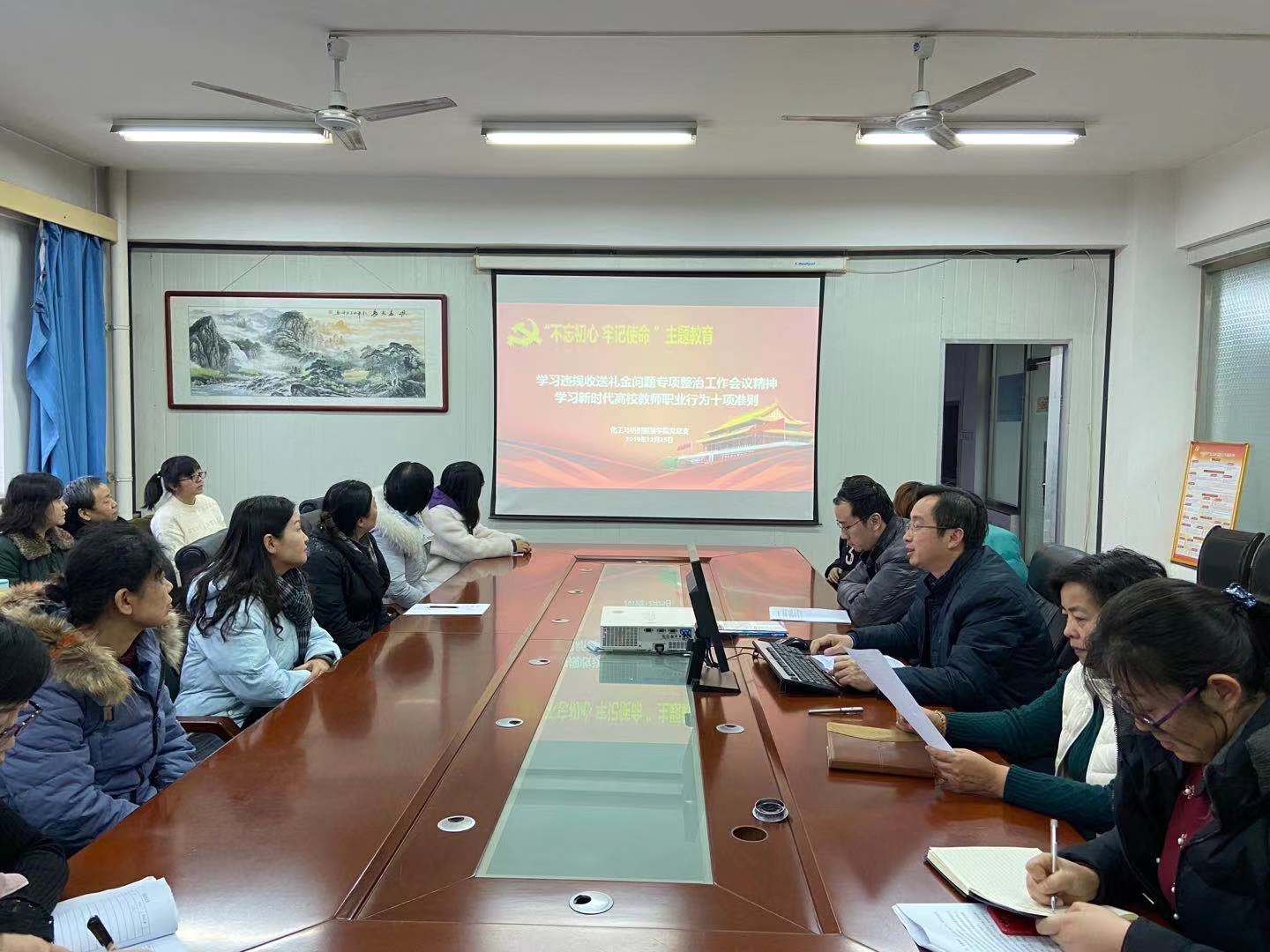 12月25日下午,化纺服学院在崇文楼811开展学习违规礼金问题专项整治工作会议精神,会议由化工与纺织服装学院党总支书记王化冰主持,全体教职工参加。