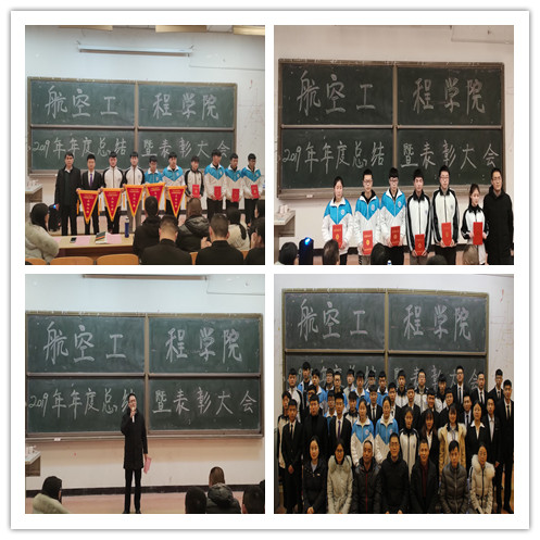 会议从VCR《忆往昔展未来》航空学院2019年年度回顾拉开帷幕,展现了2019年内学生工作取得的成就。党总支书记刘军旭宣读了在大学生手册知识竞赛、工匠精神演讲比赛、《大国工匠》征文比赛、手工艺作品展、公寓6S管理模范宿舍、践行工匠精神先进个人6项活动中涌现出来的优秀学生和集体的表彰决定并进行颁奖。随后,名善415宿舍舍长王朝阳同学、机电1903班学委魏辉同学分别代表优秀宿舍、优秀学生发言,张旭老师作为教师代表发言。