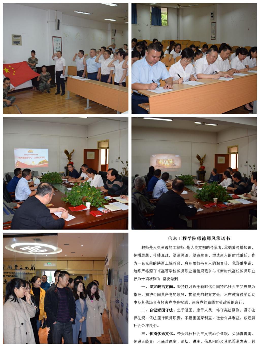 一是突出信念育德。理想信念教育在教师师德师风建设中具有重要的突出地位。信息学院以教师节为契机组织全院教师签订《信息工程学院师德师风承诺书》,所有教师郑重承诺,严格遵守教师职业道德规范,树立德高为师、身正为范的良好形象。二是突出典型树德。组织全体教师学习“时代楷模”、全国教书育人楷模、最美教师等优秀楷模。用先进典型的感人事迹诠释师德精神和内涵,发挥典型引领示范和辐射带动作用。三是突出警示立德。组织全体教师在学习《中华人民共和国教师法》《新时代高校教师职业行为十项准则》和《关于高校教师师德失范行为处理的指导意见》等文件基础上,整理《高校违反师德师风典型案例汇编》,进行师德师风反面案例警示教育,引导广大教师时刻自重、自省、自警、自励,坚守师德底线,提高法治素养、规则意识,提升依法执教、规范执教能力。
