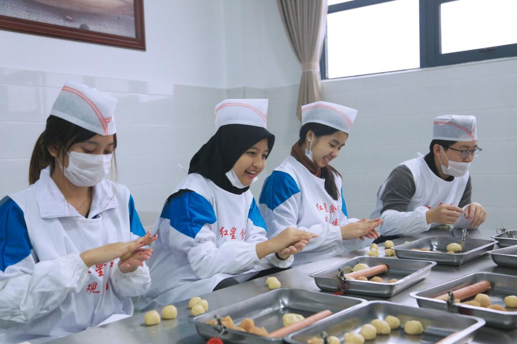 1月9日上午,在参观红星食品观光园活动中,全体留学生分别参观了红星文化博物馆和食品自动生产线,最后来到体验室亲手制作了红星软香酥,在制作过程中,留学生们亲身体验了换装、清洁、消毒这些必备的流程。在工作人员的耐心讲解下,他们初次体验了包酥、开酥等制作流程,并尝到了自己亲手制作的软香酥。红星软香酥以其独特的制作工艺和上乘的制作原料让留学生们体验到了中国现代化食品加工厂的先进工艺。