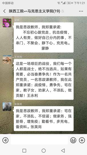 开展“战疫情网络接龙活动”:要求广大职工根据国家以及省上关于疫情防控工作的官方宣传精神,以“我是思政教师,我郑重承诺”为主题,自主编排思想鲜明、简短凝练的语句,在线依次发出承诺,不断坚定疫情防控信心。