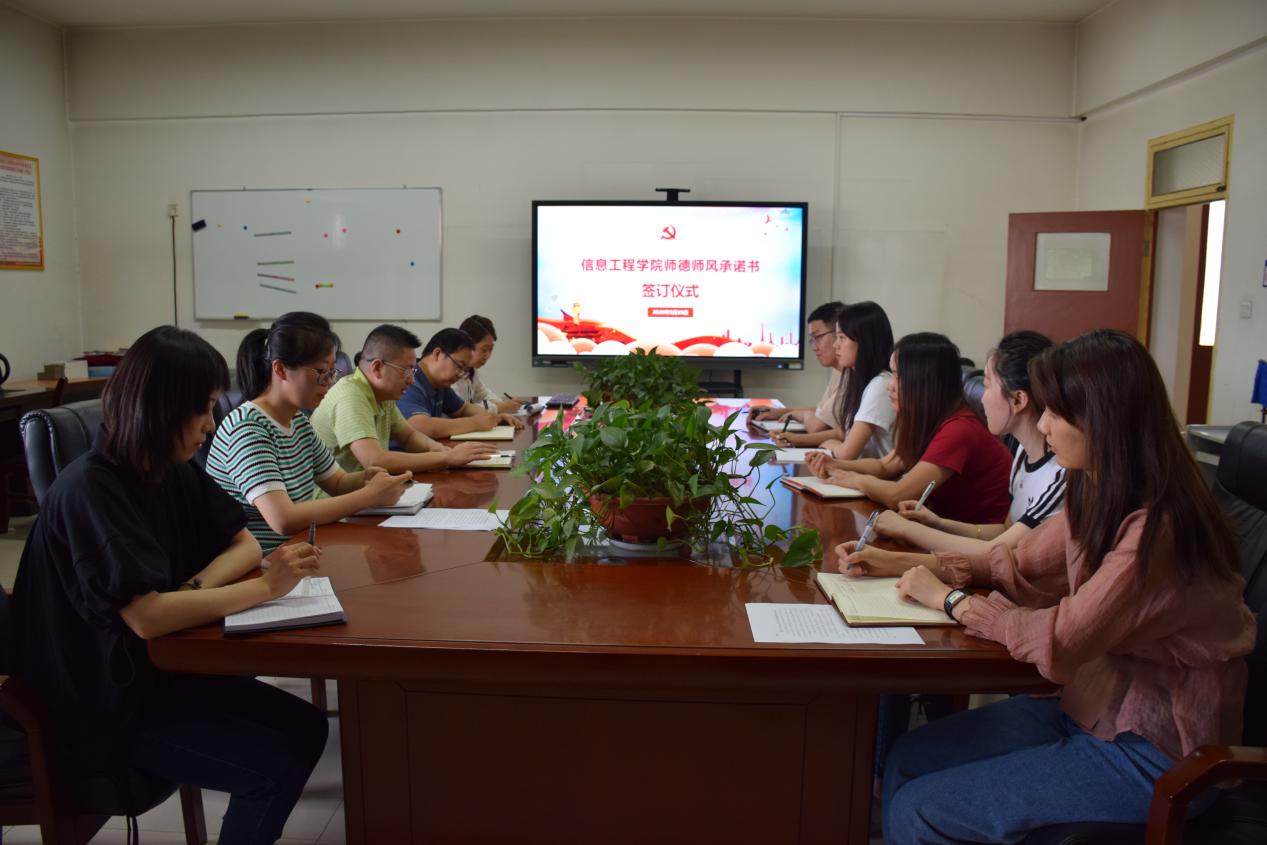 为进一步加强和改进师德师风建设,打造一支政治素质过硬、业务能力精湛、育人水平高超的高素质教师队伍,根据学院党委教师工作部的相关要求,信息工程学院于5月25日在崇文楼806会议室举行了师德师风承诺书签订仪式。签订仪式由信息工程学院党总支书记闫军主持,2019-2020信息工程学院全体新进教师参加了仪式。