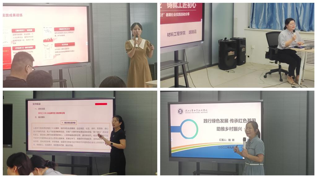 分享会中,2021年全国“挑战杯”红色专项赛优秀指导教师张雪萍以及2022年暑期社会实践省级优秀团队指导教师李晨薇、胡瑞霞、陆颖,分别从选题要点、前期准备、活动过程、成果展示、个人思想感悟等方面,通过PPT讲解、视频介绍等方式纷纷展示了在社会实践中的丰富经历和收获。随后,团委副书记薛媚结合我校2023年暑期社会实践文件,向师生介绍了大学生参与暑期“三下乡”社会实践活动的重要意义,从学校暑期“三下乡”社会实践活动的总体安排、活动原则、活动内容、活动形式、活动要求、实践成果等方面进行了解读,并对暑期社会实践要点和注意事项进行详细说明。最后,团委书记赵双军结合我校历年来社会实践活动开展情况,在实践团队组建、指导教师作用的发挥、实践课题选取、实践成果转化等方面进行了着重阐述,鼓励支持同学们将社会实践与课内专业学习、“互联网+”、“挑战杯”竞赛结合起来,提高暑期社会实践成果的转化率。