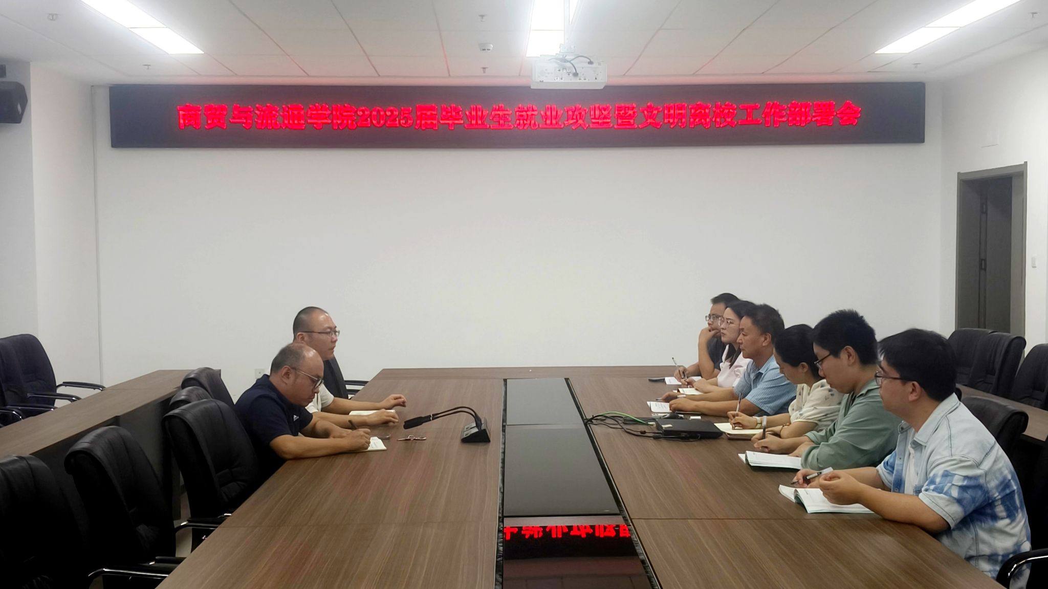为全力推动学院2025届毕业生高质量充分就业,确保毕业生安全、文明、有序离校,6月29日下午,商贸学院在崇理楼B604会议室召开2025届毕业生就业攻坚暨文明离校工作部署会。商贸学院党总支副书记蒋鹏出席会议并讲话,学工办主任王禹程主持会议。毕业班辅导员、班主任参加会议。