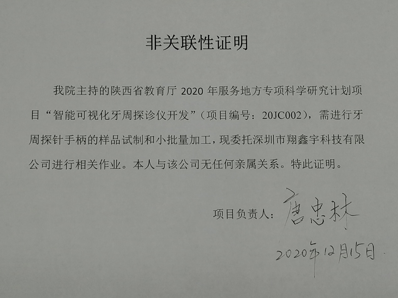 我院航空工程学院唐忠林老师科研团队承担的陕西省教育厅2020年服务地方专项科学研究计划项目“智能可视化牙周探诊仪开发”(项目编号:20JC002),拟申请牙周探针手柄的样品试制和小批量加工,按照《开云网页版app官网教科研项目经费管理办法(试行)》(陕工院院字(2020)32号)文件要求,现将信息公示如下。