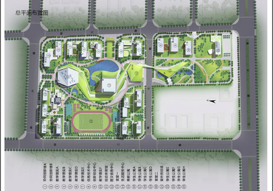 拟命名楼宇共18栋,分别是:南区青教公寓(含报告厅)、创新创业中心、信息技术中心;先进制造技术训练中心、教学理实E、教学理实D、教学理实C、教学理实B、教学理实A(命名可成系列);西区学生公寓E、学生公寓F(学生公寓可成系列)、生活服务中心、食堂一;中区图文信息中心(含报告厅2个,分别容纳400人和1000人);西区食堂二、学生公寓A、学生公寓B、学生公寓C、学生公寓D(学生公寓可成系列)等,具体详见下图。