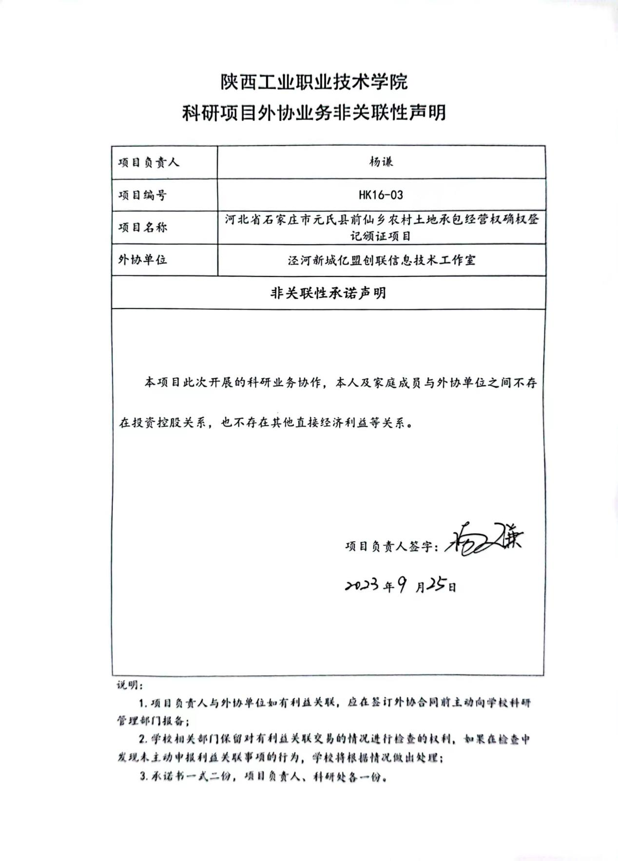 我院土木工程学院杨谦老师科研团队承担的横向课题“河北省石家庄市元氏县前仙乡农村土地承包经营权确权登记颁证项目”(项目编号HK16-03),部分工作内容拟申请第三方公司进行合作研究(包括项目区卫星遥感影像正射处理,确权登记数据库的建设等信息技术服务)。按照《开云网页版app官网横向科研项目及经费管理办法(试行)》(陕工院院字(2020)32号)文件规定,本次外协经费未超过横向合同总经费40%,现将信息公示如下。
