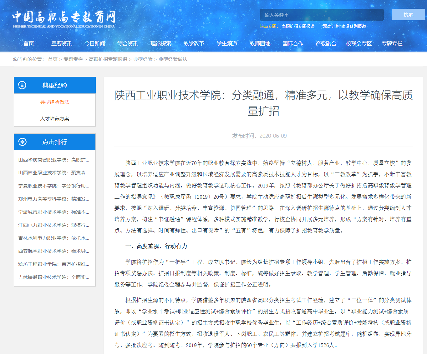 2019年,按照《教育部办公厅关于做好扩招后高职教育教学管理工作的指导意见》(教职成厅函〔2019〕20号)要求,学院主动适应高职扩招后生源类型多元化、发展需求多样化带来的新要求,按照“深入调研、分类培养、丰富资源、协同管理”的思路,在深入调研扩招生源特点的基础上,通过分类编制人才培养方案,构建“书证融通”课程体系,多种模式实施精准教学,行校企协同开展多元培养,形成“方案有针对、培养有重点、方法有选择、时间有弹性、出口有保障”的“五有”特色,有力保障了扩招教育教学质量。