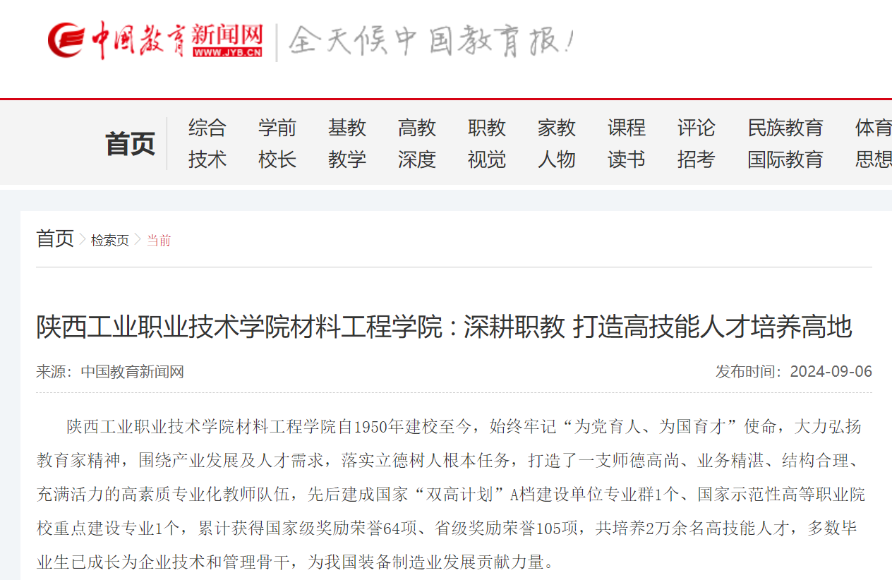 产教融合,助力成才。学院聚焦“两机”关键零部件产业高地,构建校企双主体“五联合”育人机制,创新“研学用”一体化人才培养模式,牵头制定材料成型及控制技术等三个专业国家教学标准,获国家级教学成果奖一等奖1项,毕业生就业率始终保持在97%以上,学生在国家级大赛中获奖19项,其中“互联网+”创新创业国赛金奖实现了陕西高职零的突破。