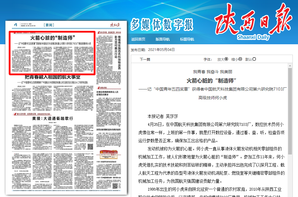 工作11年来获得的60多项荣誉印证着何小虎的不断成长。2017年,他荣获全国技术能手称号,去年获得全国向上向善好青年、全国青年岗位能手、陕西产业工匠、西安市劳动模范等多项荣誉,今年他又获得了第25届“中国青年五四奖章”。