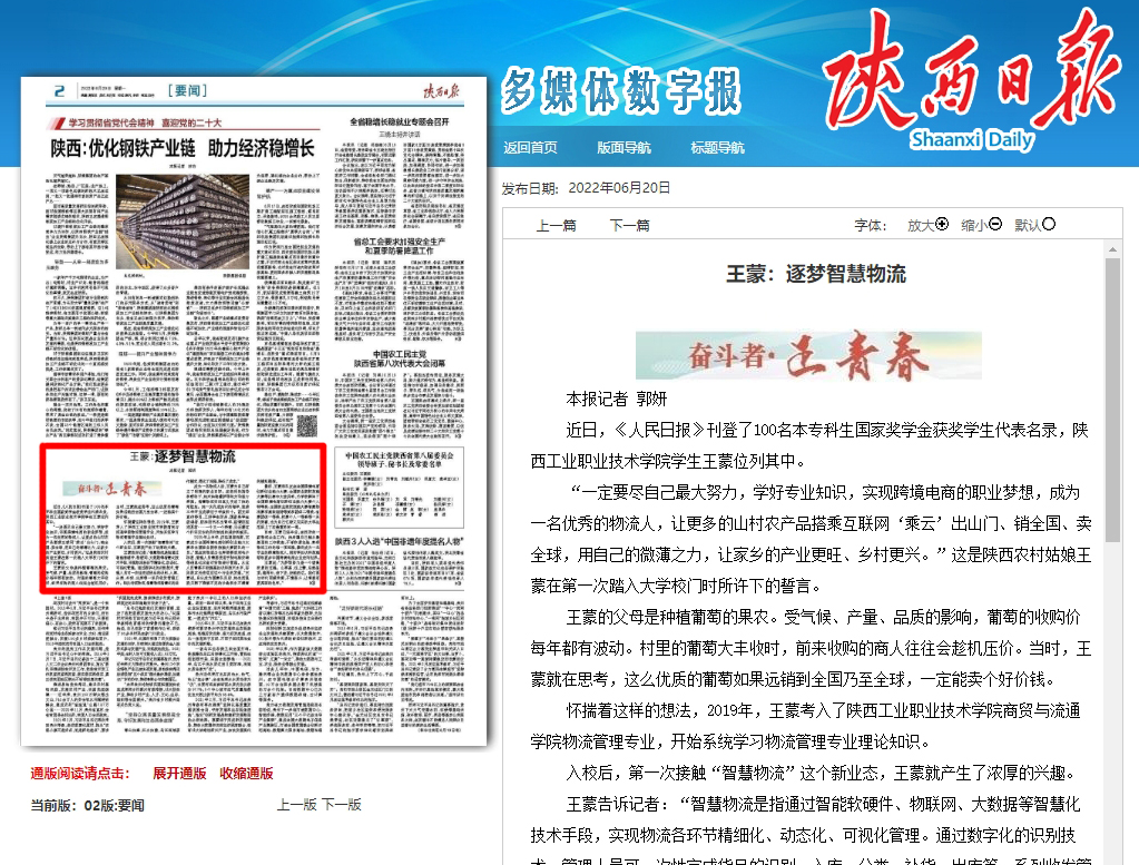 6月20日,《陕西日报》以“王蒙:逐梦智慧物流”为题,报道我校国家奖学金获奖学生,全文如下: