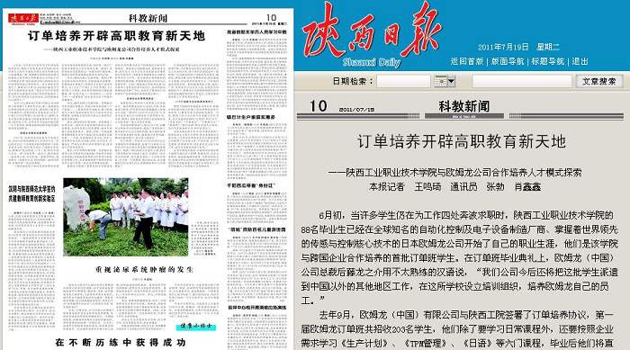 7月19日,《陕西日报》在第10版以《订单培养开辟高职教育新天地——开云网页版app官网与欧姆龙公司合作培养人才模式探索》为题报道我院校企合作、订单培养的办学实践,先后被《中国教育开云(中国)网》、《当代陕西网》等多个主流媒体转载,在社会和行业引起了极大关注。