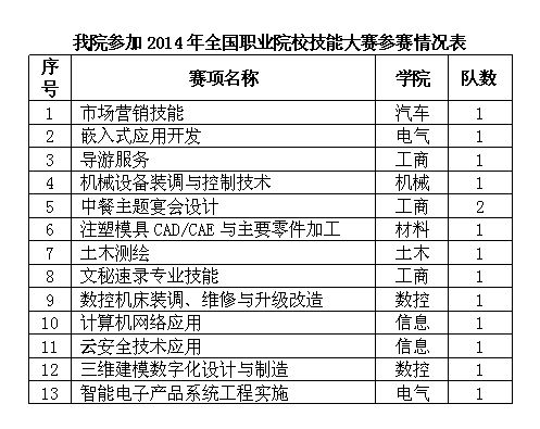 近日,2014年陕西省职业院校技能大赛落下帷幕,经过激烈比拼,我院14个参赛队以优异的成绩脱颖而出,并将代表陕西省参加全国职业院校技能大赛13个项目的决赛。截止目前,国赛网报工作已经完成,随后我院还将承接陕西省“计算机网络应用”、“云安全技术应用”、“中餐主题宴会设计”、“文秘速录专业技能”、“三维建模数字化设计与制造”、“注塑模具CAD/CAE与主要零件加工”、“机械设备装调与控制技术”等7个赛项参赛队的集中培训工作。