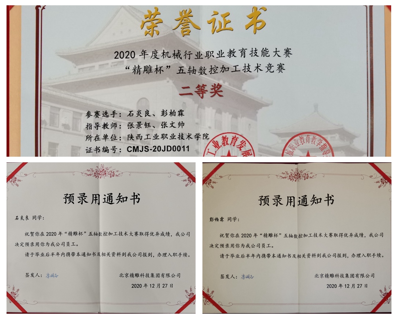 12月24—27日,全国机械行业职业技能大赛“精雕杯”五轴数控加工技能大赛在东莞市举办。本届大赛由机械工业教育发展中心、全国机械职业教育教学指导委员会主办,北京精雕科技集团有限公司承办,共有来自全国的56支学生队伍参赛。我校机械工程学院教师张景钰、张文帅指导的石炎良、彭柏霖两位同学在比赛中获得了全国二等奖的好成绩。此外,两位同学凭借在比赛中的表现出色,直接获得了北京精雕科技集团有限公司的录用证书,