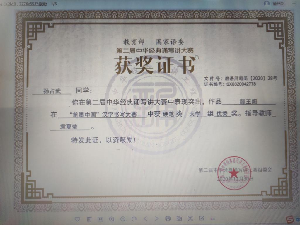 近日,由教育部、国家语委主办的第二届中华经典诵写讲大赛落幕。我院大学生艺术团上报的硬笔书法《滕王阁序》获全国优秀奖,朗诵作品《致敬人民》获陕西省三等奖,袁夏莹获指导教师奖。