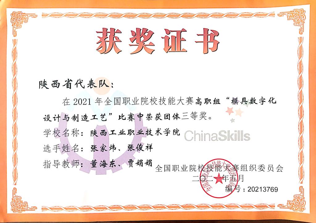 6月16日至17日,2021年全国职业院校技能大赛高职组“模具数字化设计与制造工艺”赛项在山东省济南举行,本次赛项由山东省教育厅、济南市人民政府承办,山东职业学院联合山东辰榜数控装备有限公司等9家合作企业共同协办。来自全国各地的26支参赛队伍、114名师生参加。我校由材料工程学院董海东、贾娟娟两位老师指导的张家炜、张俊祥二位选手代表陕西省参赛。经过紧张激烈的角逐,最终荣获团体三等奖。