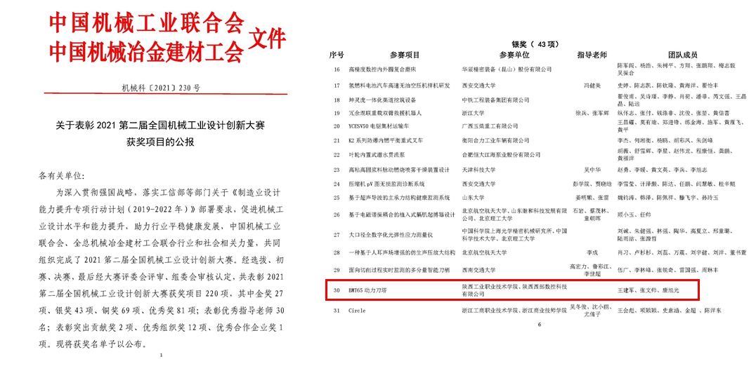 近期,2021第二届全国机械工业设计创新大赛决赛结果揭晓,我校教师王建军、张文帅的作品《BMT65动力刀塔》荣获银奖。