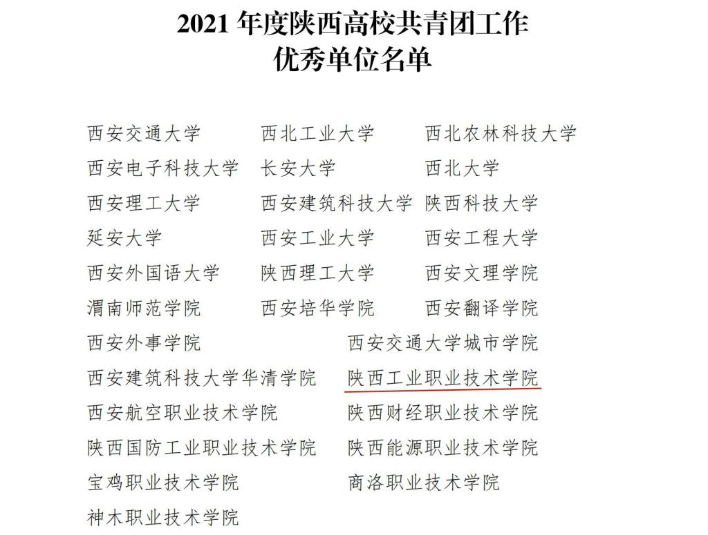 近日,共青团陕西省委、中共陕西省委教育工委印发了《关于2021年度陕西高校共青团述职评议考核结果的通报》,我校荣获“2021年陕西高校共青团工作优秀单位”,校长刘永亮荣获“2021年陕西高校支持共青团工作好书记(校长)”,财经与旅游学院团总支书记杜娟荣获“2021年陕西高校共青团工作先进个人”。