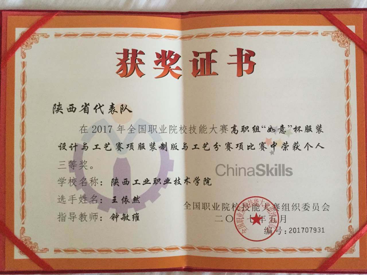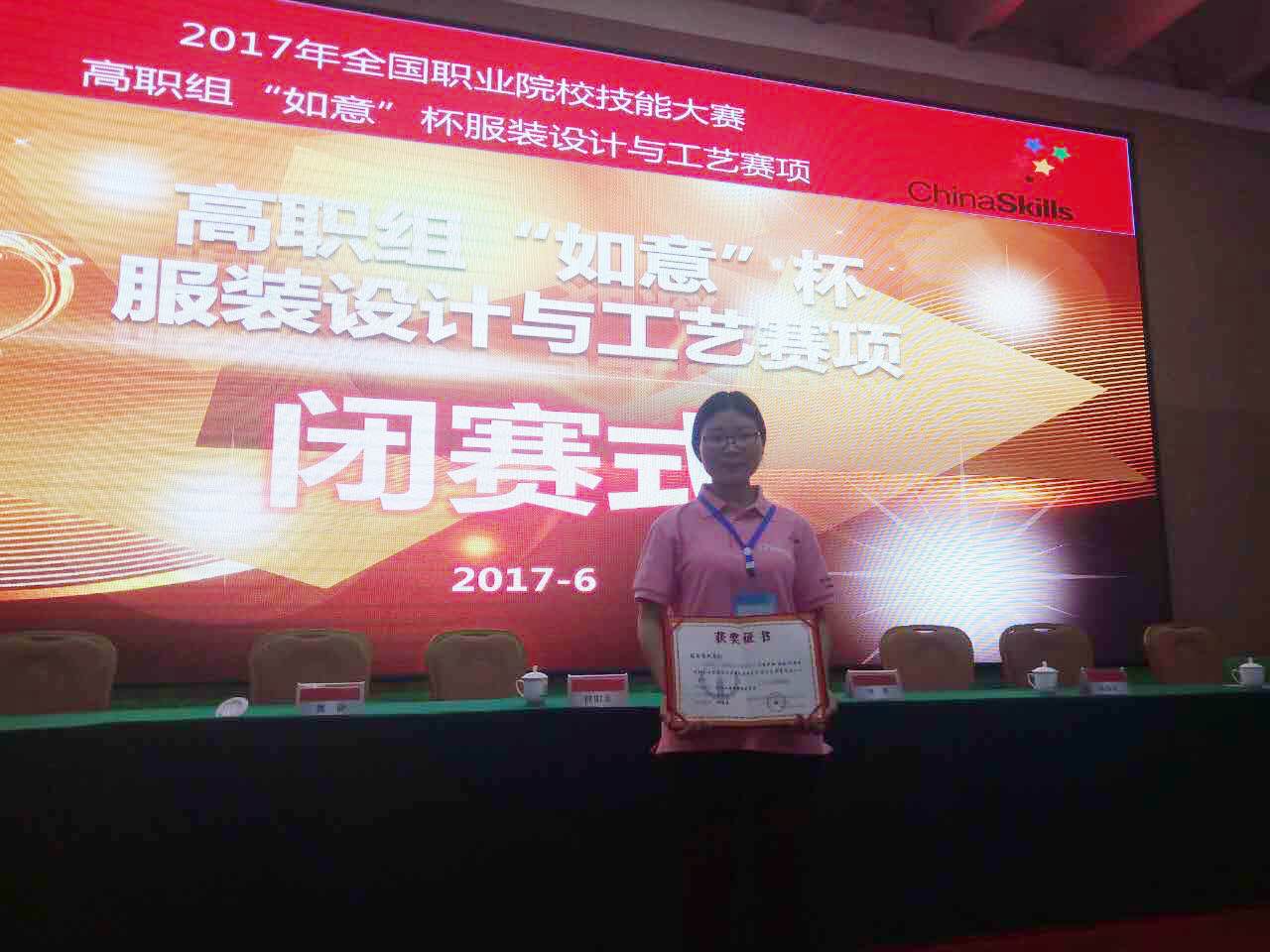 6月2至3日,2017年全国职业院校技能大赛高职组“如意杯”服装设计与工艺技能大赛在山东科技职业学院举行,来自全国26个省、市、自治区75所学校的162名选手参加,经过两天的激烈角逐,由我院化工与纺织服装学院教师团队钟敏维、杨玫、张雅娜指导的服装制版与工艺1501班王依然同学获得服装制版与工艺分赛项三等奖。