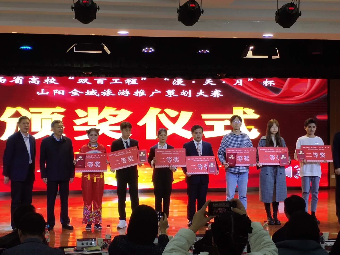 10月31日,陕西省高校“双百工程”“漫·天·月”杯山阳全域旅游推广策划大赛总决赛在西北政法大学长安校区举办。我校信息工程学院数字媒体应用技术专业 “六个臭皮匠”团队(胡洋铭、贺煜、杨文婷、郭一玮、党东旭、李珂越)荣获二等奖,“打卤面”团队(李佳豪、胡新鹏、张敏敏、邓亚丽、辛育婷)荣获优秀奖,指导教师赵强、曹珊被评为“优秀指导教师”,数字媒体应用技术专业19级胡洋铭、贺煜、胡新鹏、邓亚丽被山阳县聘为“旅游宣传大使”。