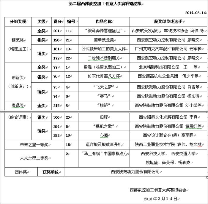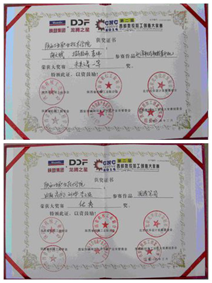 3月14日,由陕西省机械工业协会、陕西省机械工业联合会、北京光华设计发展基金会、陕西机械工程学会主办,碑林环大学创新产业带管委会承办的第二届“西部数控加工创意大赛奖”在曲江会展中心隆重举行,我院选送的作品“巡洋舰及舰载直升机模型”获学生组一等奖,冉朝、高宇飞老师的作品“圆鼎笔筒”获优秀奖。
