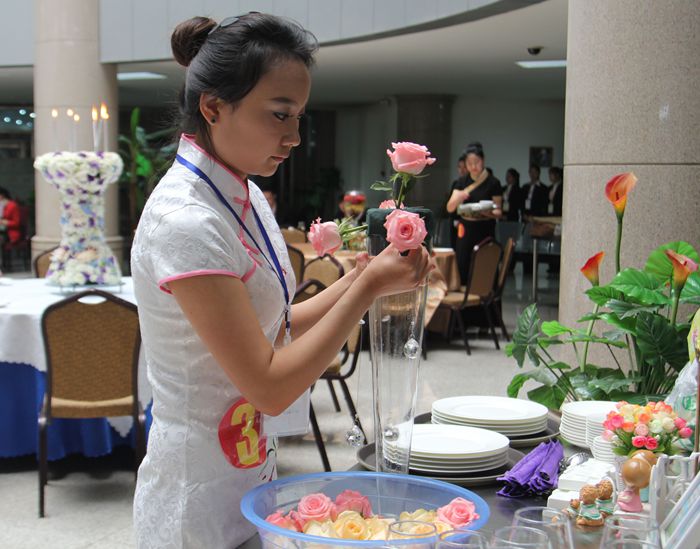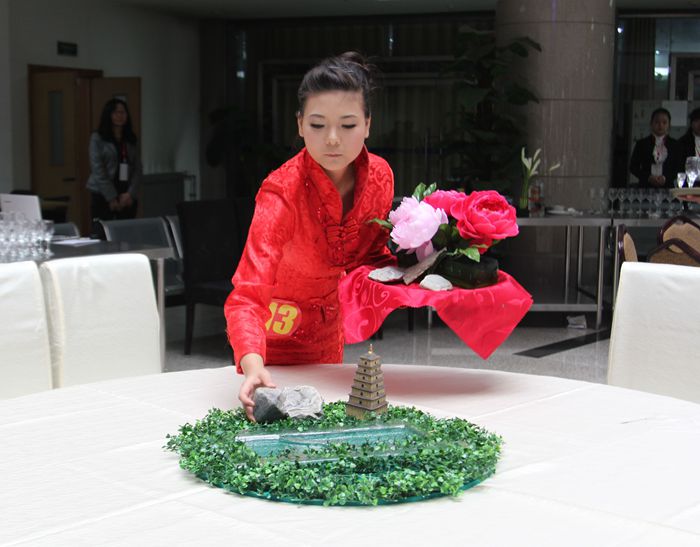 “中餐主题宴会设计”赛项以餐饮业实际经营中主题宴会设计的标准和要求为主线,涵盖职业形象展示、台面创意设计、菜单设计、餐巾折花、中餐宴会摆台、斟酒、英语口语、专业理论、现场分析等内容。 大赛得到了学院的重视,备战期间,工商管理学院领导重视、部门支持、教师钻研、选手努力,拟计划撰方案、做好各项协调工作,为大赛的顺利进行提供了保障。
