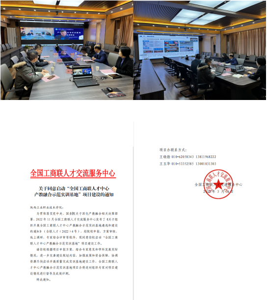 我校积极筹备推进相关申报工作,2023年1月16日我校与全国工商联人才交流服务中心举行了产教融合示范实训基地项目立项线上调研会议。全国工商联人才中心副主任张一卫、产教融合工作负责人王晓勃,我校副校长梅创社、材料工程学院院长李云、教务处副处长舒蕾等相关人员参加了调研会议。