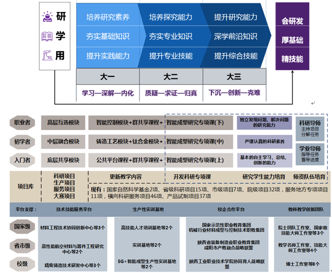 与国家级高新技术企业宁夏共享集团、国家制造业创新中心西安增材制造国家研究院有限公司深度合作,校企共同投入资本、技术、场地等生产要素共建产教融合型实训基地,企业负责基地核心设备投入、技术迭代升级和产业化运营,学校负责场地及配套设备投入,立足“五化”开展建设。实施“技术技能服务提升计划”,完成陕柴重工、陕西天成航材、法士特集团等企业的员工培训、新产品试制、技术攻关项目,承担国家自然科学基金等科研项目。实施“优师优育计划”,构建“科研反哺教学项目库”,组建由博士、教授组成的优质师资队伍,以“自愿报名、严格遴选、过程考核、滚动淘汰”的形式组建“培优班”,参与科研项目全过程,实施“研学用”一体化人才培养。
