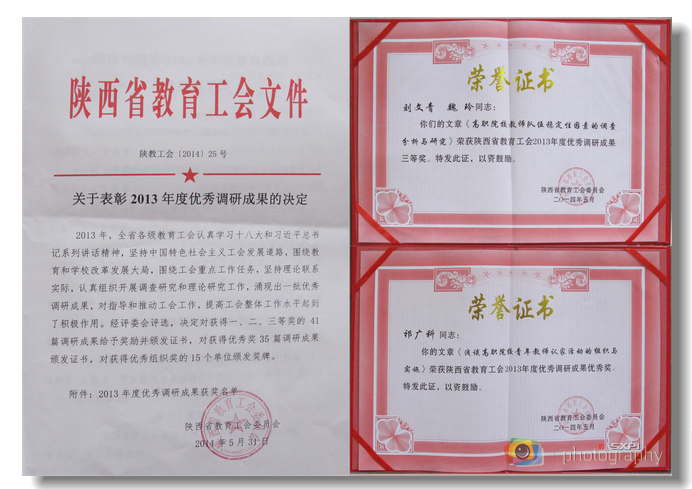 在刚刚结束的陕西省教育工会工运理论年会上,我院工会主席刘文青和图书馆魏玲联合调研、撰写的《高职院校教师队伍稳定性因素的调查分析与研究》荣获省教育工会2013年度优秀理论调研成果三等奖;工会祁广科撰写的论文《浅谈高职院校青年教师认家活动的组织与实施》获得优秀奖。
