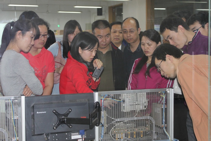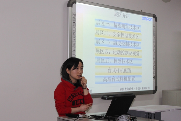 何丽工程师围绕欧姆龙公司主要产品(包括欧姆龙PLC系列设备、传感器、温控器,安全产品、视觉产品、伺服变频、HMI等)的组成、功能以及欧姆龙实训中心五个产品展示区(包括精密测量技术区,安全控制技术区,温度控制技术区,运动控制及视觉区,传感区技术区)两个部分展开培训。细致耐心讲解和现场操作演示的同时,何丽工程师还和电气学院老师进行了广泛交流,现场气氛非常活跃。