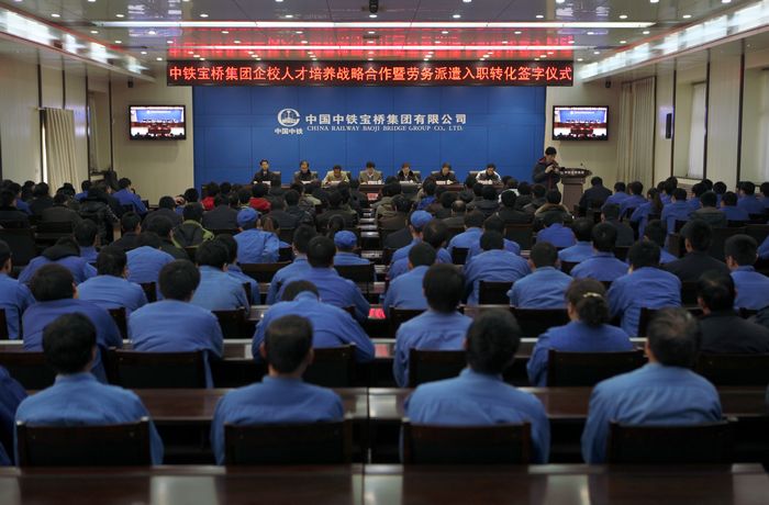 会上,中铁宝桥集团总经理李宗民致欢迎辞,人力资源部部长姚伟国作《关于中铁宝桥集团技能人才使用、培养、转化录用情况的报告》,报告中对于我院毕业生在企业“定位准确,吃苦耐劳,安心一线工作,动手能力强,有发展潜力”的优异表现给予高度赞扬。随后,双方正式了签订《企校人才培养战略合作协议书》。