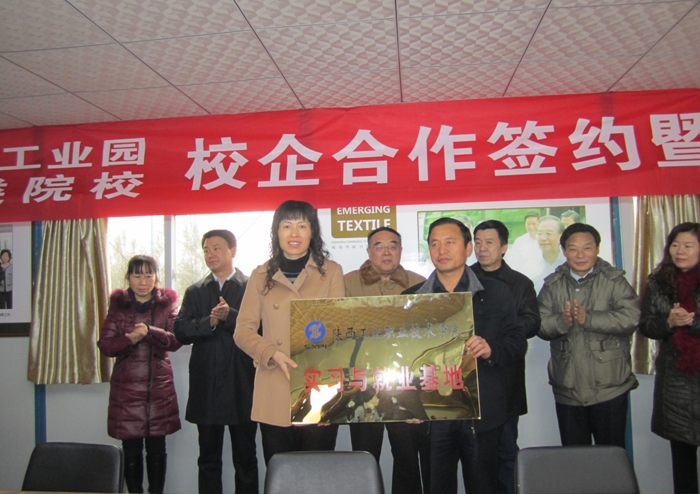 我院孙小云处长介绍了我院基本情况和纺织服装专业办学特色,并希望双方加强合作与交流,建立长期的合作关系。随后举行了我院与咸阳市新兴纺织工业园校企合作协议签字仪式和校企合作实训基地授牌仪式。