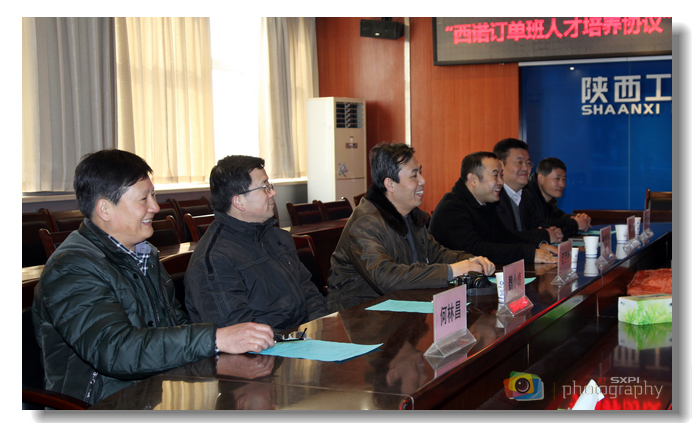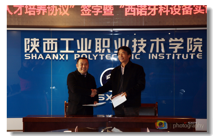 1月2日下午,我院与西北医疗器械(集团)有限公司“西诺”订单班人才培养协议签字暨“西诺牙科设备实训室”揭牌仪式在崇文南楼第一会议室举行。西北医疗器械(集团)有限公司总经理李爱国、营销总监窦波、总经办主任聂西社、技术部副经理魏小峰、手机事业部制造部经理何林昌、总装车间主任刘登峰和我院院长崔岩、副院长王晓江、教务处、数控工程学院相关负责同志出席,王晓江副院长主持仪式。