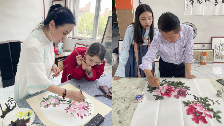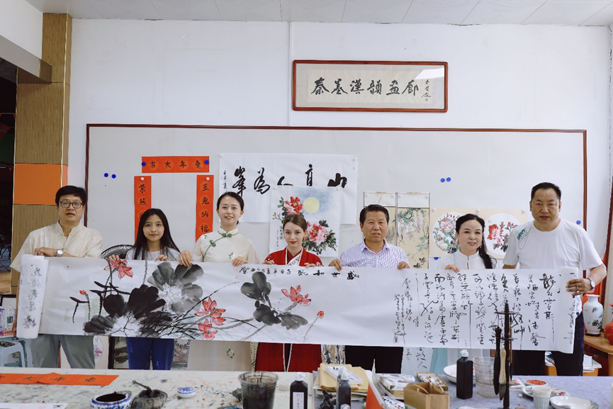 活动的第一部分由高建科老师简单讲述了传统书法知识。首先高老师对书法用到的文房四宝“笔、墨、纸、砚”进行逐一讲解,指导留学生正确的执笔方法、书写姿势和书写章法,使留学生对中国书法有了初步的认知。同时,还展示了隶书、行书、楷书不同字体的书法作品。其次,书画老师们耐心地为留学生们示范握笔方式,细心讲解毛笔书写技巧。在老师的专业指导下,留学生们尝试提笔书写简单的毛笔字,并很快掌握要领,逐渐能够连贯地写出汉字。来自俄罗斯的留学生萨沙拿起蘸满墨汁的毛笔,一笔一画尝试书写春联。活动的第二部分由王新团老师和刘芳老师简单介绍了中国画的独特之处,并让留学生欣赏了优秀的中国画作品。中国画是具有悠久历史和优良传统的中国民族传统绘画,创作过程是运用毛笔蘸水、墨、彩作画于纸上。来自印尼的留学生唐美在王新团老师的指导下,尝试用毛笔画牡丹写意画。在书写和绘画的过程中,留学生们不仅亲身体验了中国传统的书法与绘画文化,也增加了对中国文化的了解。