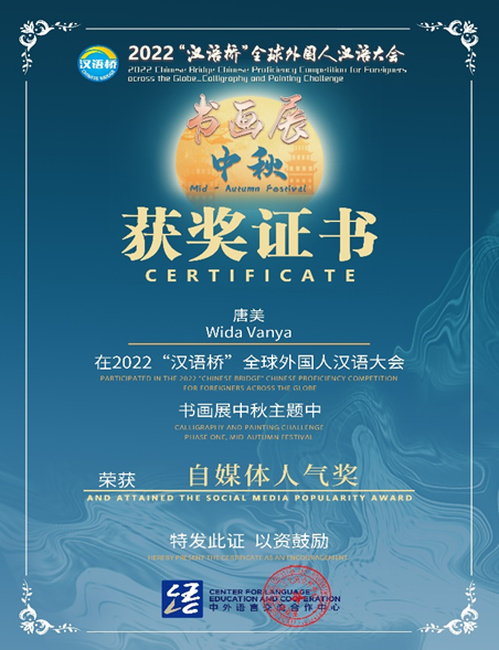 2022“汉语桥”全球外国人汉语大会书画展组委会公布“中秋”主题获奖作品。我校2022届印尼留学生唐美的绘画作品《花好月圆》荣获“自媒体人气奖”。让汉语走向世界,通过艺术形式传播中国精神,是实现“中国梦”的一个重要组成部分。该活动为我校留学生实践、体验中国艺术之美提供了机会,促进了不同国家文明的交流和互鉴。