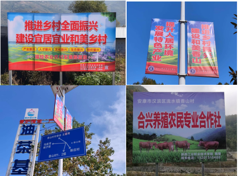 在我校和建设银行联合支持下,香山村一段入村主干道的排水沟上方进行了混凝土加固,并砌起了一段100米长的砖墙,在美化环境的同时也提升了防止水土流失的效果。香山村山道曲折弯延,方向难以辨别,在我校和建设银行的支持下,三个容易走错的岔路口安装了交通指示牌,并在村主干道由我校捐赠的20个路灯上安装了灯杆道旗进行文化宣传,此外还对两块大型宣传板进行物料设计和张贴。