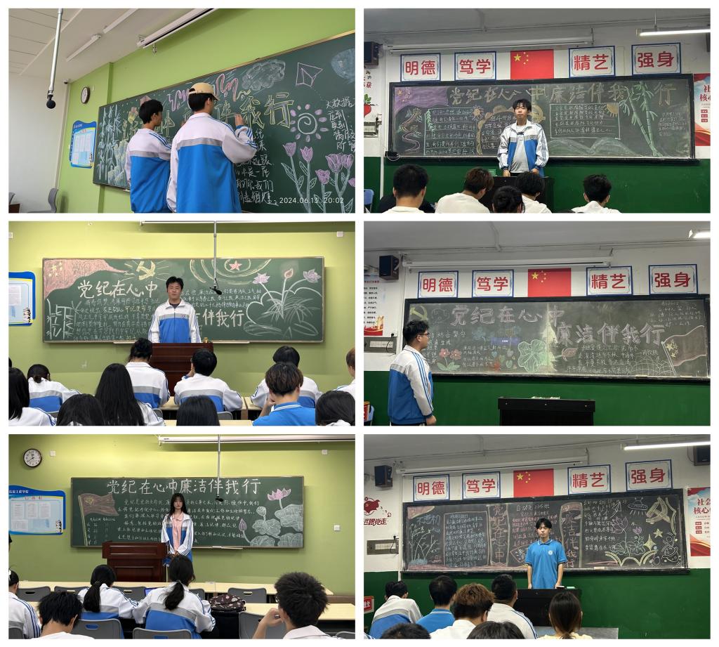 为深入学习贯彻习近平总书记关于党纪学习教育的重要讲话和重要指示精神,加强团员青年的纪律意识、责任意识、服务意识,坚守廉洁自律的作风,让青年学生更加自觉地学习党纪党规,始终以党章党规党纪作为标准约束自己的一言一行。6月13日晚自习,校团委制定活动方案,各二级学院团总支精心组织策划,全校各班团支部开展了“党纪在心中,廉洁伴我行”主题团日活动。