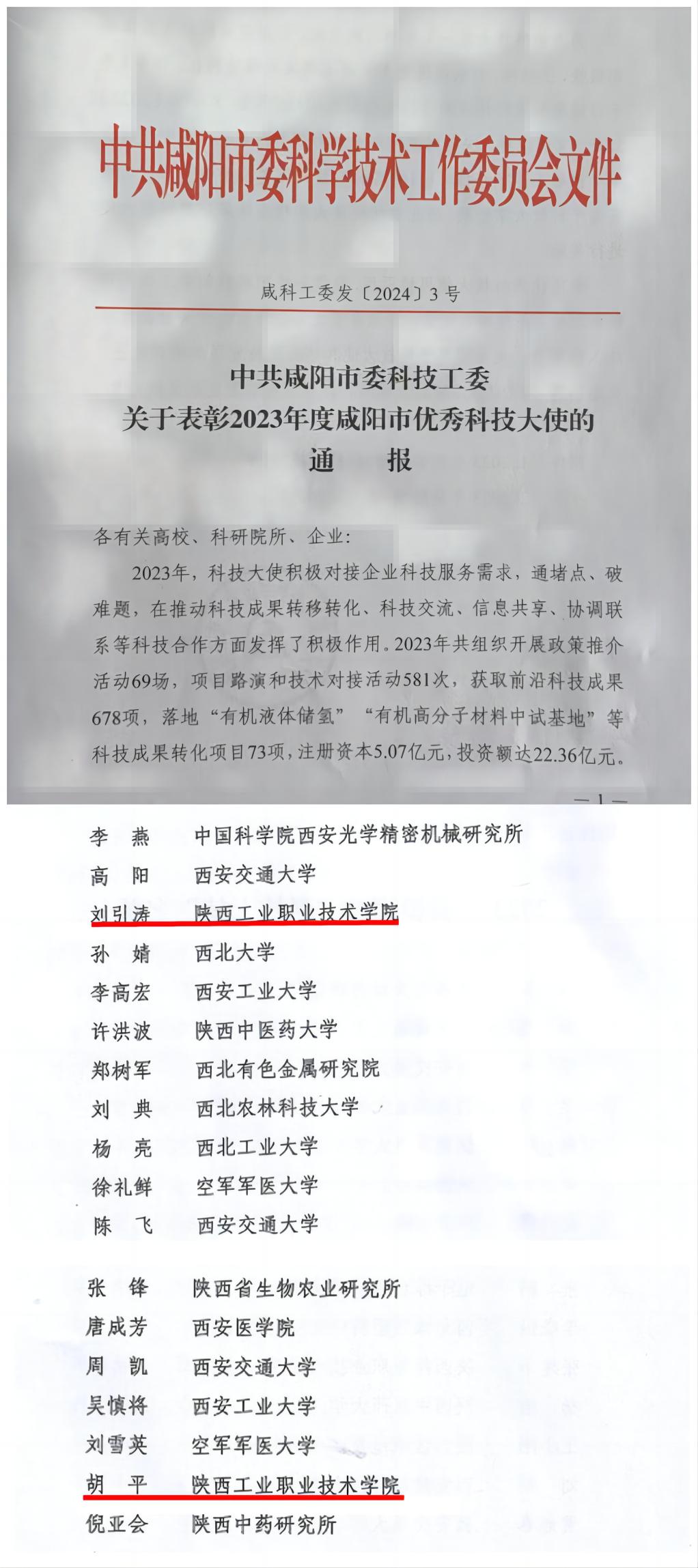 近日,根据《咸阳市打造秦创原科技成果转化先行区领导小组办公室关于表彰全市科技系统先进集体和先进个人的决定》(咸秦领办发【2024】1号)《中共咸阳市委科技工委关于表彰2023年度咸阳市优秀科技大使的通报》(咸科工委发【2024】3号)文件精神,我校获得咸阳市多项表彰,其中学校荣获2023年度咸阳市引智先进单位,科研处处长刘引涛获咸阳市技术合同交易“桥梁”奖和优秀科技大使荣誉称号、西部创新创业研究院院长胡平获优秀科技大使荣誉称号,科研处技术服务科李思敏获咸阳市技术合同交易“红娘”奖、国际交流处杨和获咸阳市引智“先锋”奖。